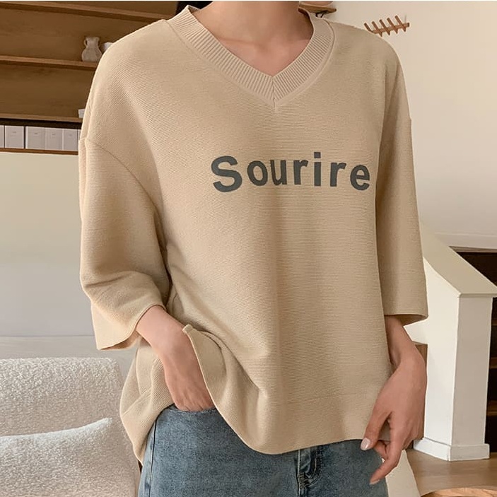 首頁 > 全部商品 > 正韓 V領七分袖落肩 開岔下擺針織字母上衣【RA7531】