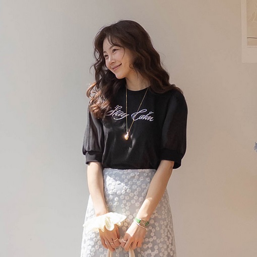 正韓 天絲柔美薄紗泡泡袖 珍珠字母T上衣【B75321】