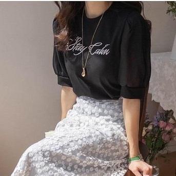 正韓 天絲柔美薄紗泡泡袖 珍珠字母T上衣【B75321】 | Foreverkids 韓國時尚精品、韓國代購、正韓空運、洋裝、吊帶褲、外套、針織外套、寬褲