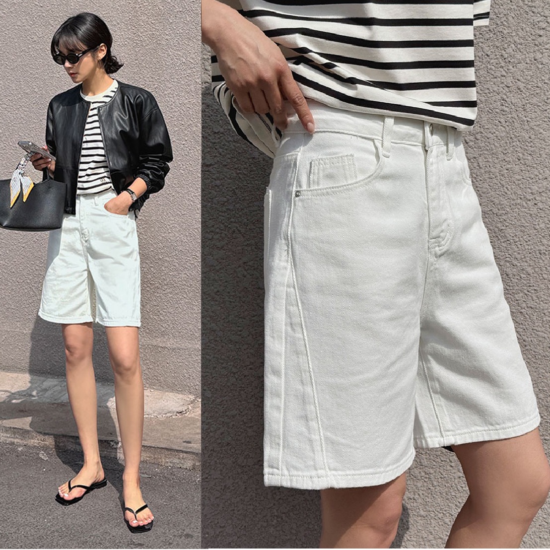 正韓 個性斜切車線五分褲 牛仔白色【A75327】韓國代購 | Foreverkids 韓國時尚精品、韓國代購、正韓空運、洋裝、吊帶褲、外套、針織外套、寬褲